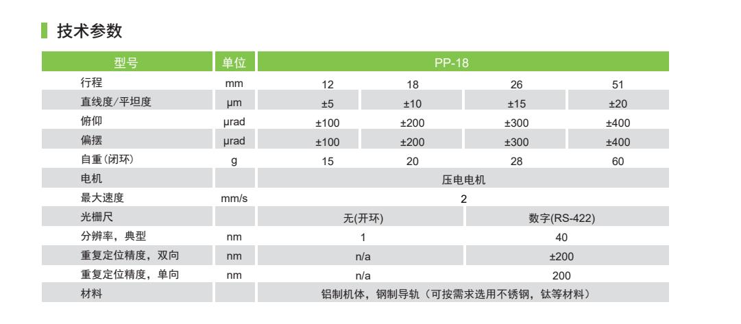 PP-18是一款低成本位移平臺(tái)。使用壓電電機(jī)和交叉滾子導(dǎo)軌,可以平滑實(shí)現(xiàn)高速(>2mm/s)和高保持力(>1.5N),采用集成光柵尺來(lái)提供優(yōu)良的重復(fù)精度。PP-18可兼容MMC-100和MMC-110控制器。