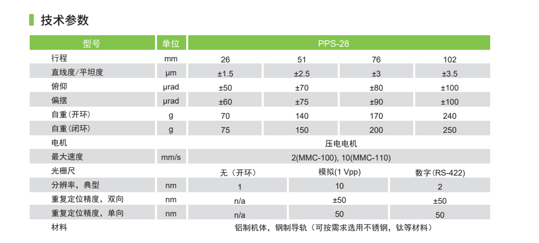 PPS-28是一款高精度,長行程的直線壓電位移臺。微型交叉滾子導(dǎo)軌保證了在負(fù)載高達(dá)50N時(水平方向)仍可保持高精度和導(dǎo)向精度。它采用了專利技術(shù)的壓電電機,可實現(xiàn)>10mm/s的高速和高保持力(>2N)。PPS-28可采用開環(huán)控制方式或者使用光柵尺。閉環(huán)分辨率可達(dá)2nm。還有可在真空環(huán)境(10-9mbar)可供選擇。PPS-28可兼容MMC-100和 MMC-110控制器。
