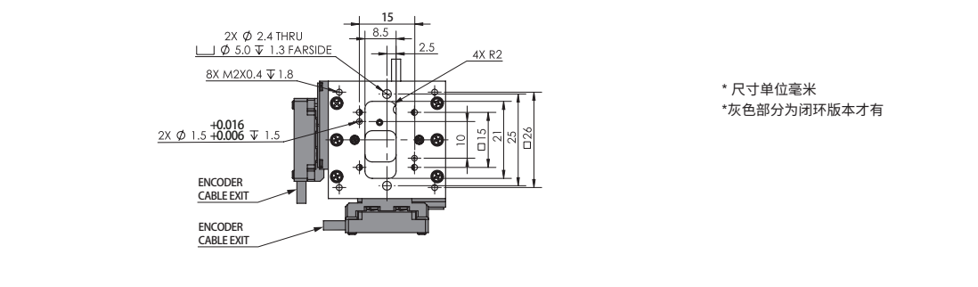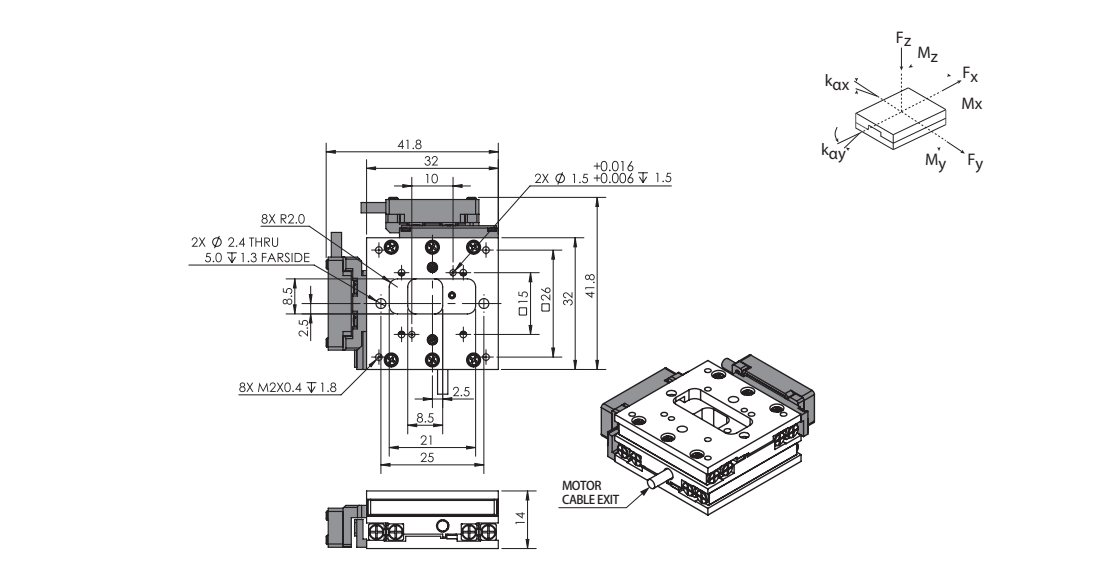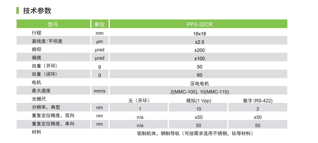 PPX-32CR是一款超薄型長(zhǎng)行程XY位移平臺(tái),厚度僅為14mm。交叉滾子導(dǎo)軌可確保在高達(dá)10N的負(fù)載下的運(yùn)動(dòng)平順和穩(wěn)定。它采用了一款壓電電機(jī)來(lái)達(dá)成高速度(>10mm/s)和高保持力(2N)。PPX-32CR可以采用開(kāi)環(huán)控制或者使用光柵尺。閉環(huán)光柵尺分辨率可達(dá)2nm。還有可用于真空環(huán)境(10-9mbar)的版本可供選擇。PPX-32CR可兼容MMC-100和MMC-110控制器。