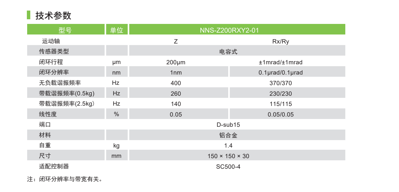 NNS-Z200RXY2-01是一款高精度納米運動平臺。集成Z軸和Rx/Ry在一起,結構緊湊。電容傳感器全閉環(huán)控制,精度高。大通孔設計,陽極氧化黑工藝,滿足多場景應用。